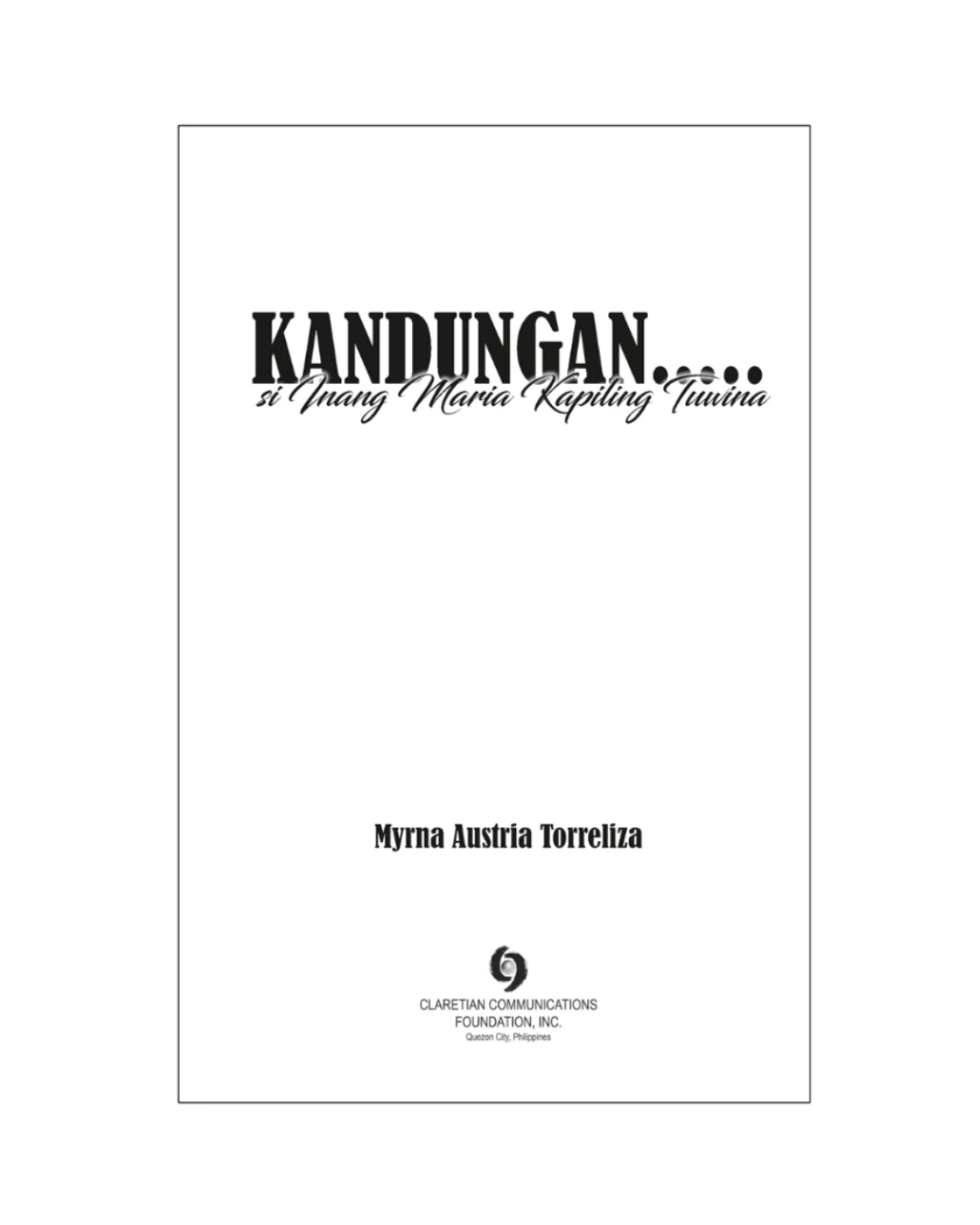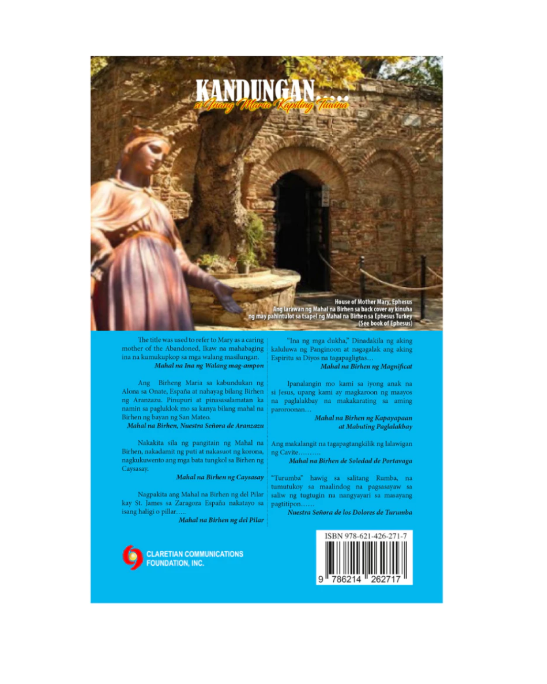 Ang larawan ng Mahal na Birhen sa back cover ay kinuha ng may pahintulot sa tsapel ng Mahal na Birhen sa Ephesus Turkey (See book of Ephesus) The title was used to refer to Mary as a caring mother of the Abandoned, Ikaw na mahabaging ina na kumukupkop sa mga walang masilungan. Mahal na Ina ng Walang mag-ampon. Ang Birheng Maria sa kabundukan ng Alona sa Onate, España at nahayag bilang Birhen ng Aranzazu. Pinupuri at pinasasalamatan ka namin sa pagluklok mo sa kanya bilang mahal na Birhen ng bayan ng San Mateo.