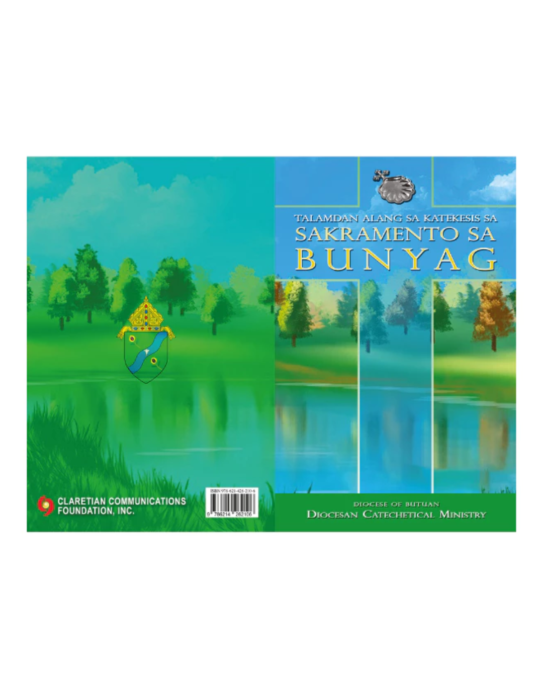This booklet’s cover is an adaptation of the Diocese of Butuan’s coat of arms, particularly its elements of the blue wave and the fields of green. While originally pertaining to the Agusan River, the cover accentuates this aquatic symbol to recall the Jordan River where Christ was baptized. Moreover, this evokes the Easter and baptismal antiphon Vidi Aquam, alluding Ezekiel 47, which says: “I saw water flowing out of the Temple, from its right side, alleluia: And all to whom this water came were saved, and they shall say: alleluia, alleluia.” The field of green evokes its liturgical meaning of hope and life which is given by Christ to all the baptized. The word Bunyag is encased in crosses as a reminder of the salvific gift rendered to all through the ultimate Sacrifice at Calvary.